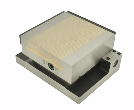 - Stół magnetyczny prostokątny, jednostronnie uchylny przeznaczony do mocowania elementów ferromagnetycznych (tj. żelazo, stal konstrukcyjna, stal stopowa, żeliwo) podczas szlifowania, frezowania i obróbki elektroerozyjnej w pozycji poziomej jak i pod kątem do 52°.
