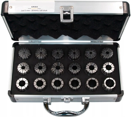- Zestaw tulejek ER32 3–20 mm. Wysoka precyzja 0,015 mm, norma DIN6499. Idealne do frezarek, tokarek i CNC.